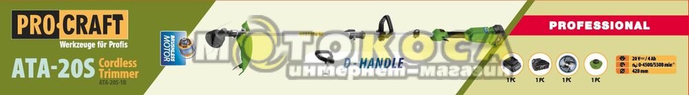 Теги: Тример акумуляторний ProCraft ATA20S (1 АКБ та ЗП) D-ручка, PROCRAFT, Тримери садові електричні